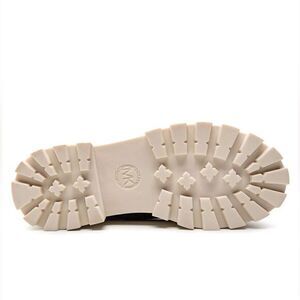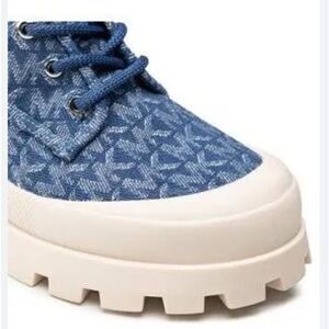 Michael Kors Denim Jacquard Combat Boots. Features all over initials with white rubber soles. Side zipper closure. Heel height of 1.5”. 20% Cotton. NEW WITH BOX