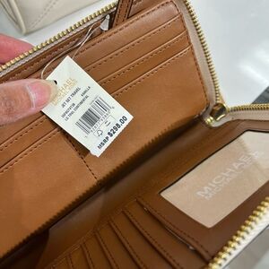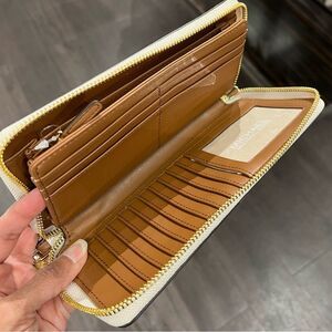 NWT Michael Kors Jet Set Travel Continental Wristlet Wallet New SM MK Signature Vanilla/Acorn 100% Authentic Retail: $188 Plus Tax Gold Toned Hardware PVC Leather Zip Around Closure Custom Fabric Lining 16 Card Slots, ID Window 3 Multi-Function Compartment 8.25"(L) X 4"(H) X 1"(D) 8" Removable Strap Very Clean, Smoke-Free and Pet-Free Environment.