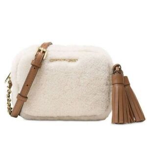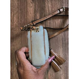 Exterior features gleaming hardware, logo, double tassel and allover fur