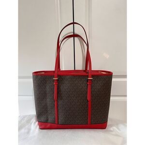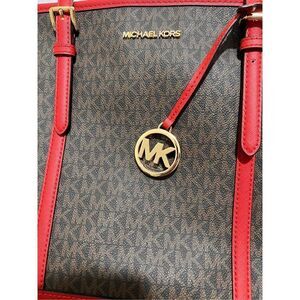 Brown MK logo pattern plus gorgeous red leather trim.