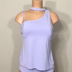 You're sophisticated by the shore in this stunning look from Michael Kors, a sleek tankini top with a choker neckline and single shoulder strap rimmed in studs. Removable soft cups with elastic below the bust. Pullover styling; removable shoulder strap at right, non-adjustable shoulder strap at left. Choker collar with three adjustment slots hook-and-loop closure. Hits at waist.
