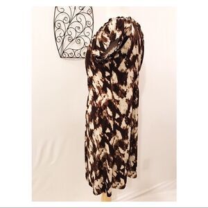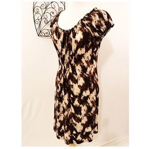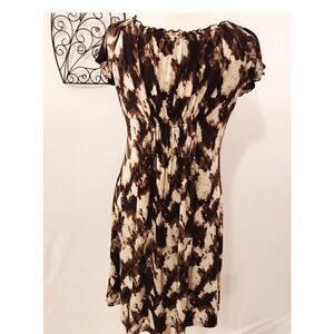 Super comfy pullover Michael Kors knit dress. Rounded collar, cap styled sleeves, elastic elbow bodice and across on the back. Elastic around the collar and sleeves. Beige, brown and light brown