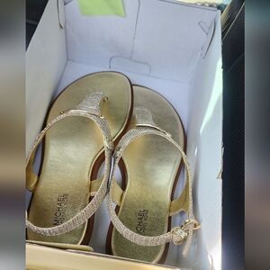 Look sophisticated when wearing the Plate sandal from Michael Michael Kors. This sleek silhouette is fashioned with a textured upper and gold metal accents that will give your ensemble the spark it deserves!