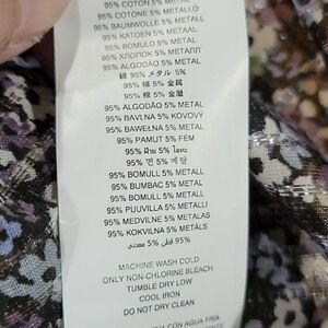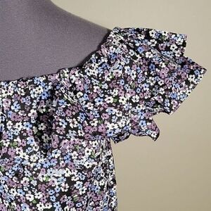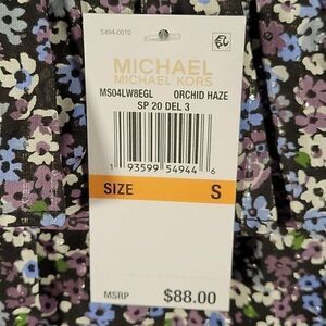 This adorable off-the-shoulder floral blouse from Michael Kors has ruffles all along the top. Content: 95% cotton, 5% metallic fiber. Care: machine wash, tumble dry.