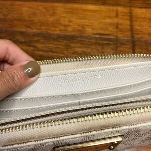 Zipper closure. MK print. Inner zipper pouch. Various credit card slots and cash slots.
