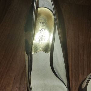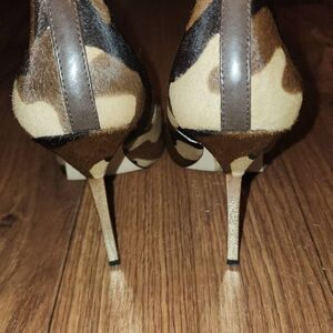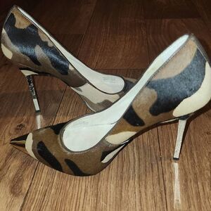 Beautiful camouflage calf hair pump gold 4.5" heel with gold tip on the toe