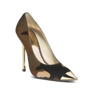 Beautiful camouflage calf hair pump gold 4.5" heel with gold tip on the toe