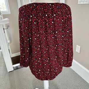 Michael Kors stylish yet casual pullover pheasant-style blouse with heart print. Featuring a loose blousy fit that’s tapered with elastic around the scooped neckline, 3/4” balloon sleeves and hemline. Cotton/model blend. Length 34”, Width 20”. NWT