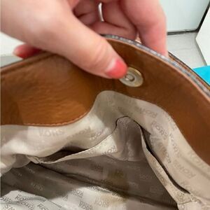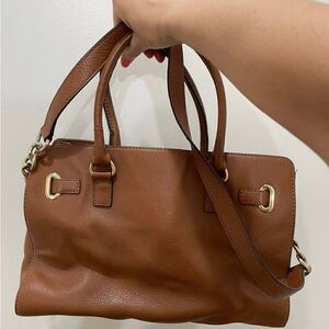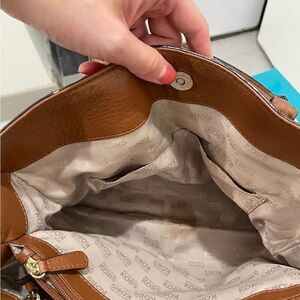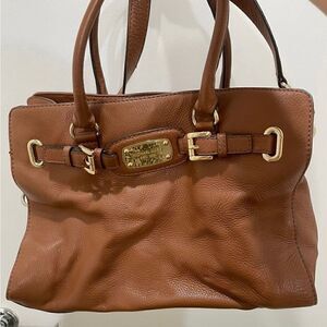 Authentic Michael Kors Brown Leather Tote. Some scuffing at the bottom and handles. There are 2 small stains in the inner side, please see them from the photos.