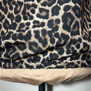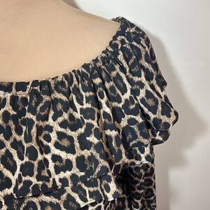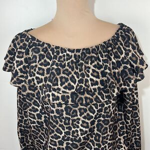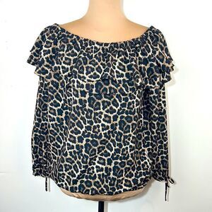 Very good condition, smoke-free. Michael Kors size small. Cheetah print, double ruffle at the neck. Can be worn on or off the shoulders. Small elastic band at the bottom of the shirt. elastic and tie detail at the bottom of the sleeves.