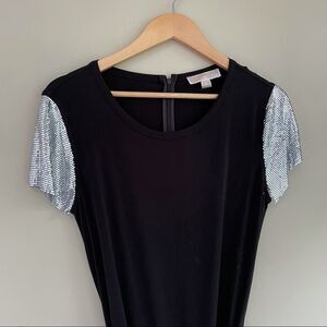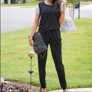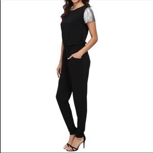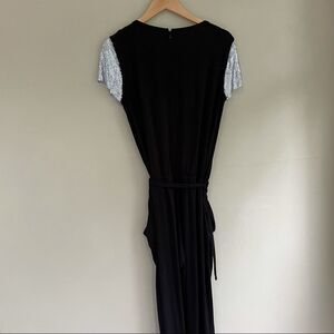 Silver sleeve part is ripping on one side - see pic. Length is 63 inches. Gorgeous jumpsuit!
