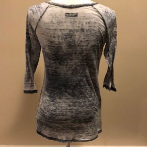 Gently worn shirt. Long but fitted. Material not available but very this. Deep u shape neck. Small hole as pictured. Looks great w leggings. Pet and smoke free. JZ.