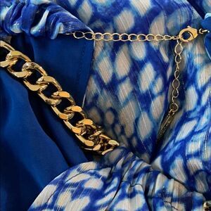 Michael Michael Kors tent dress. Blue and white print with gold metallic threading throughout. Chain halter neck. Fully lined. High low hem. Gently used condition