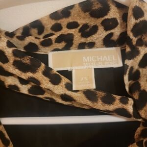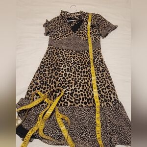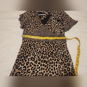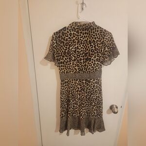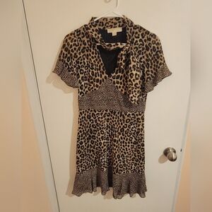 This is a Michael Michael Kors dress featuring a leopard print pattern on a knee-length fit & flare design. It has short ruffle sleeves, a V-neckline, and a lightweight woven polyester fabric. The dress has a pullover closure and is handmade, suitable for weddings and parties in the summer or spring. The multicolor dress is adorned with ruffle accents and is a regular size XS for women.