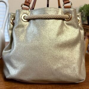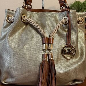 Michael Michael Kors Marina Large Metallic Canvas Tote in Gold and Brown Leather trim and Gold Toned hardware