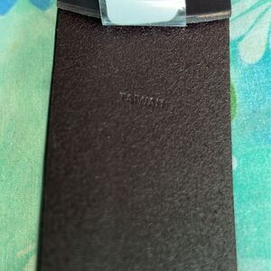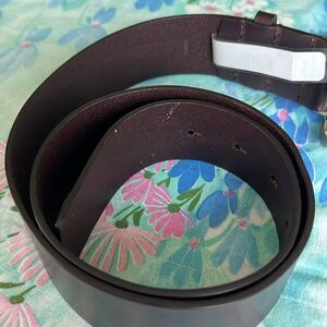 LNWT Shiny Brass (?) Metal circle logo belt. Dark espresso brown leather belt. Like new very tiny scuffs on the buckle. Still has bar code tag attached.