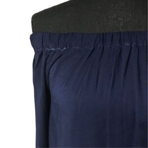 Features and details: dark navy, lightweight, long sleeves with split and flared bottom cuffs, off-shoulder design with strong elastic band.
