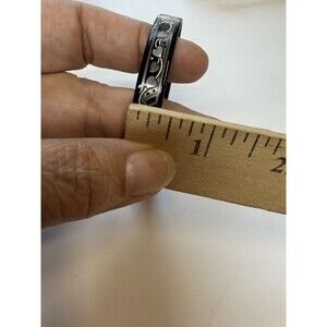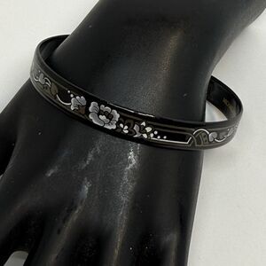 Beautiful vintage enamel and painted bangle bracelet from artist Michaela Frey. Black enamel with charcoal gray, light gray, silver, and white floral leaf painted details. Stamped Michaela Frey team. Fits a wrist size 8 1/4 inch. In excellent preowned condition.