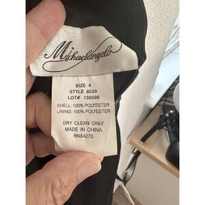 This stunning Michaelangelo formal black dress is perfect for any occasion, whether it's a party, cocktail event, or formal occasion. The dress features a sleeveless design with a flattering V-neckline and a zip closure. The long, flowing gown is made from high-quality polyester material with beaded accents that add a touch of glamour to the classic, 90s theme.