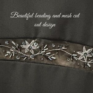 This stunning Michaelangelo evening gown is perfect for any formal occasion. The black chiffon dress features intricate beading and a mesh cut out detail that adds a touch of sophistication. The V-neckline and sleeveless design make this dress perfect for a party or cocktail event.