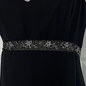 This stunning evening gown by Michelangelo is sure to turn heads at your next formal event. The black beaded dress features a flattering V-neckline and an empire waist, creating a slimming and elegant silhouette.