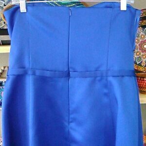 Royal blue satin strapless dress. Fitted bodice with support for a perfect fit. Waist is circled with a satin belt closed with a silver and rhinestone buckle. Full lining has a net ruffle to keep the skirt full. Size 14 measures 37 at chest, 32 at waist, 48 at hips, 35 long from under arm to hem.
