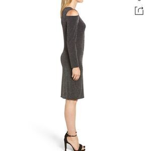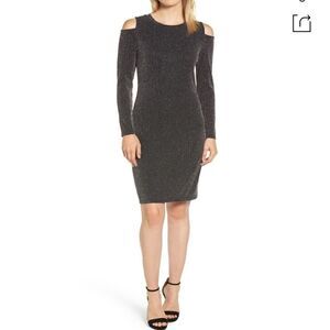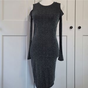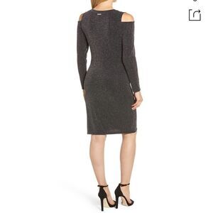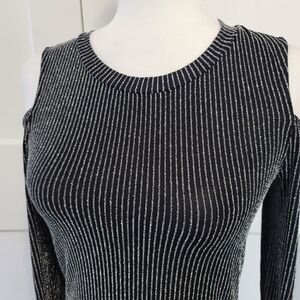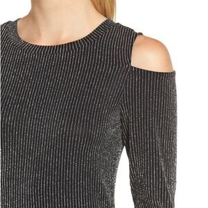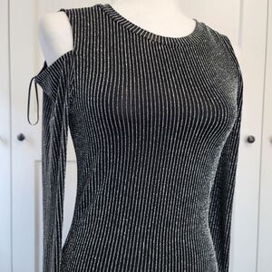 Showstopping dress by Michael Michael kors allover metallic shimmer stripes and flirty cold shoulder sleeves