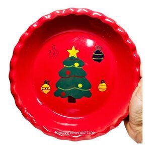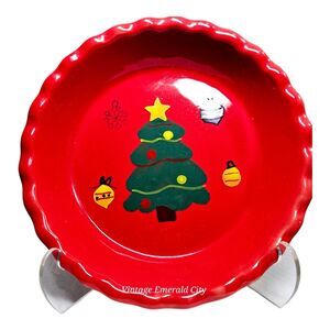 Keywords: Michael's pie dish, red holiday baking dish, Christmas tree plate, hand-painted bakeware, festive serving dish, holiday pie plate, collectible Christmas baking dish.