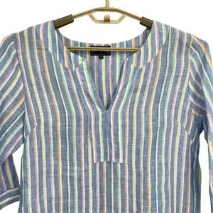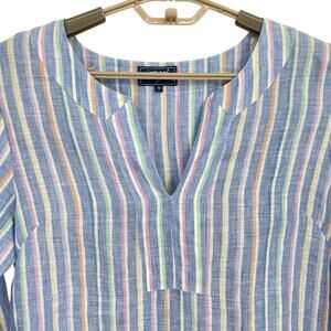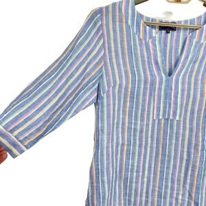 Fun linen stripe tunic top. Chambray blue with white yellow, purple pink , and green stripes. Three-quarter length sleeves and a V cut out neck. Side slits. Size medium new without tags. Laid flat it measures approximately 20 inches from armpit to armpit and the length from the top of the shoulder down. The back is 32 inches.
