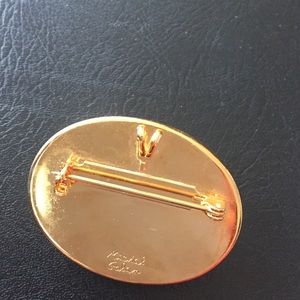This ornate gold tone colored brooch with Black stones can be worn as a pin or placed on your chain and worn as a pendant. The brooch is approximately 1 3/4 inches long and 1 inch wide. Excellent condition; gently worn.
