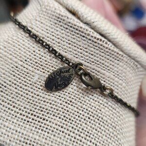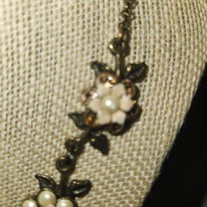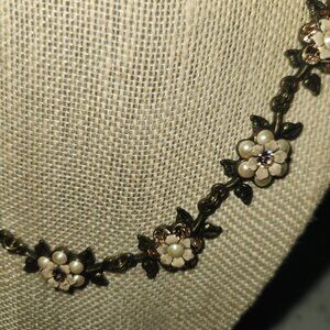 Delicate and feminine necklace by designer Michal Negrin, known for her romantic, vintage-inspired creations. This piece features a series of enameled floral stations in antique gold-tone metal, accented with faux pearls and sparkling crystals. The flowers are linked together for a continuous garland effect, creating an elegant statement that’s perfect for both everyday wear and special occasions.