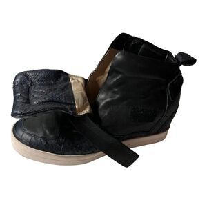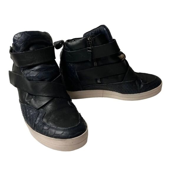 Kennel Schmenger for Michalsly RARE collaboration heeled sneakers. Made from genuine snakeskin leather. Color is navy blue. Decorative side zippers with Velcro closure for easy on and off. High top style with hidden wedge inside. US size mens 5.5, womens 7. Measures approximately 9.5” heel to toe.