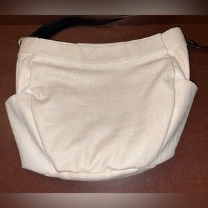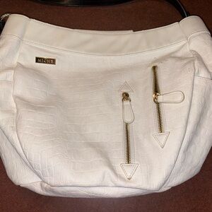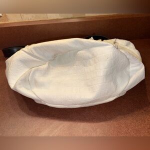 ✔️ The Anndrea shell (white faux croc texture with gold-tone zipper details)