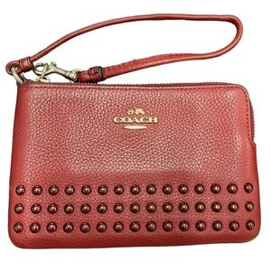 The red Miche Dabney Shells feature lightly-textured faux leather in rich tomato, complemented by black edges and a red band accent with dangling two-tone metal clover logo plate. Silver/Gold hardware; end pockets.