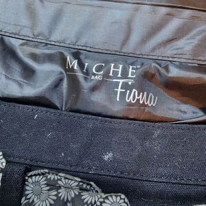 Miche Prima black shell with a black, white, and gray daisy pattern bow.