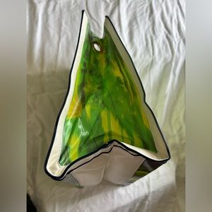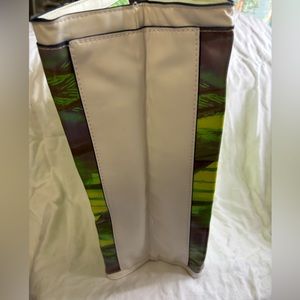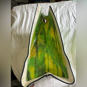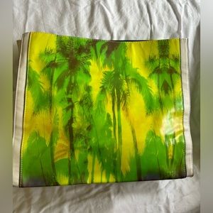 A palm tree print in shades of yellow, orange, green and blue was inspired by tropical beaches and sways against a white faux leather background. Reversed seams with navy painted edges, gold rivet accents and front zippered pocket add cool to your hot-weather looks. Rectangle bottom.