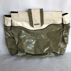 Miche Wendi Prima green and cream shell to be used with Miche base bag and handles (not included). Preowned condition with some minor outer imperfections (shown in photos); otherwise good condition. Two outer side snap pockets.