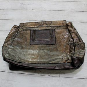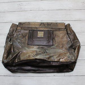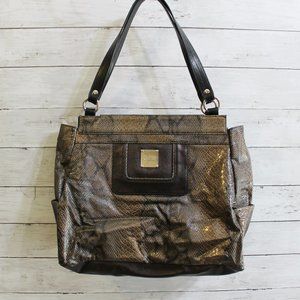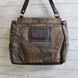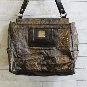 This Miche shell is brown snakeskin animal print with brown faux leather trim and two side pockets. It fits Miche's big prima shoulder bag base. Please know this is for the shell only. It is in excellent near to new condition.