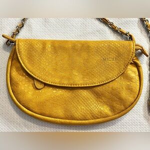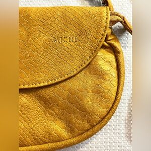 The Miche Yellow Crossbody Bag is a stylish accessory that combines functionality with a vibrant pop of color. Crafted in a compact design, it features a unique braided strap and a chic crescent shape, making it perfect for everyday use.