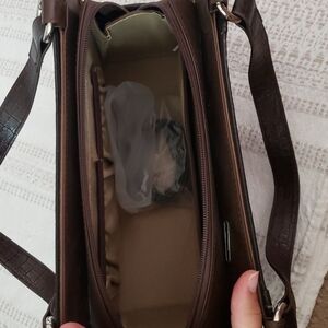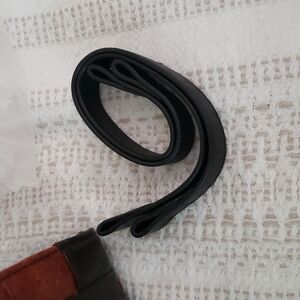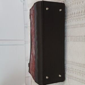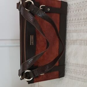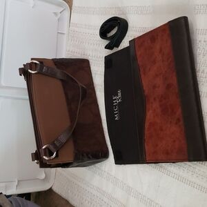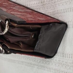 Miche shoulder bag, double strap bag, comes with base purse, one red/orange/rust color textured panel cover, interchangable straps, comes with brown and black. Silver metal rings, structured bag. Size 11.5x7.5,