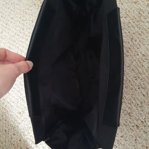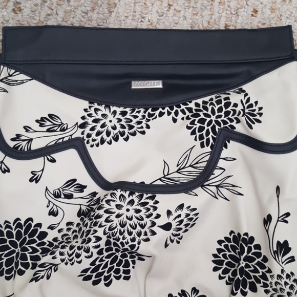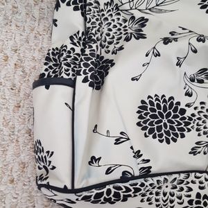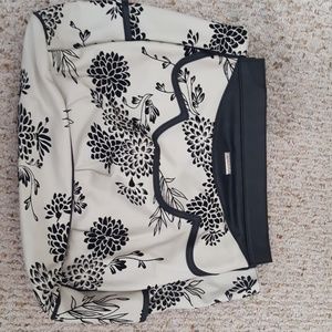 Cream with velvet black floral pattern. Used a few times years ago. Small amount of blue on bottom corner from wearing jeans; probably could be cleaned. Not noticeable when in use.