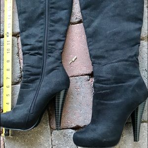 This pair of Michael Antonio black suede feel and look boot, can be worn with any outfit to add some pop! Like new boots are so comfortable and easy to walk with. These boots can dress up a pair of leggings or jeans and look spectacular with a pair of shorts, dress or long shirt. You won’t be disappointed.