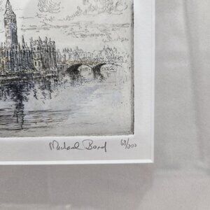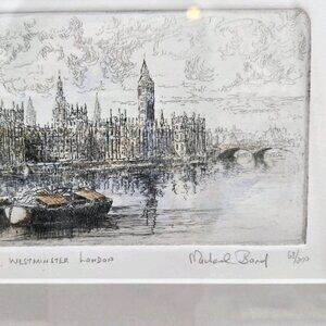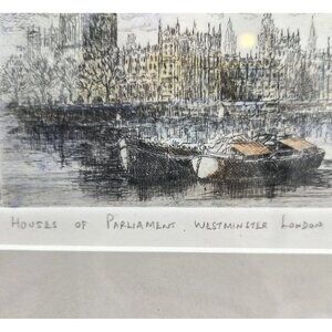 The product is a drypoint etching by English artist Michael Bond depicting the Houses of Parliament in London.