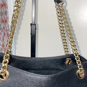 Micheal Kors Black Saffiano Leather Bag. Gold Hardware . 2 Exterior Side Pockets. Strap is Gold in Color Chain with Leather. Interior has 1 Large Zipper Pocket and 4 Slip pockets. Has Care instructions manual. W15”xH11”xD5” Strap Drop 10” Bag is preowned the MK logo has minor surface scratches and the straps have minimal wear.