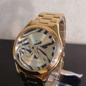 Authentic Michael Kors MK 4561 brand new women's watch. This watch is gorgeous and is in excellent excellent condition and still has the plastic wrapping on it. The watch has a gold band with a beautiful dial that has the MK initials in the center and has the most beautiful design with crystals. The case is 42mm and the band can be adapted to your size. Please go check out the pictures to see for yourself. If you have any questions please let me know thanks