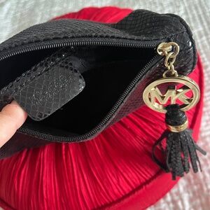 NWOT. Authentic Micheal kors makeup bag never used in brand new Perfect other condition and perfect clean interior. This cosmetics case has a gorgeous tassel with micheal kors gold metal charm. Very unique black glossed snake scale like fabric. Has MK print logo all over inside lining. Has 3 divided sections inside.