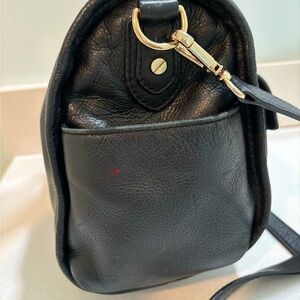 In good condition, some wear on the hardware and zipper & small red paint stain on one side of the bag.