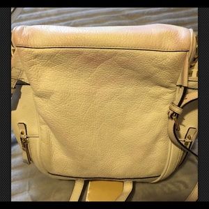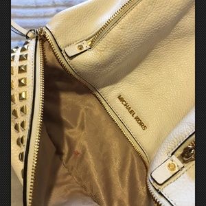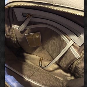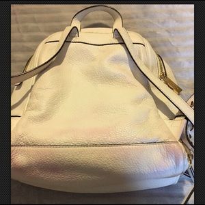 Micheal Kors , cream white backpack, nice bag , It has a couple of spots shown in pics. The bottom of bag has a little pink on it , not noticeable when carrying . Its brand new has tags on inside. Handles are great condition.It one spot on inside also in first pocket shown in pic.
