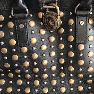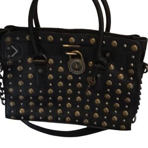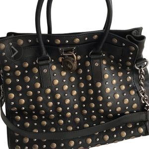 Micheal Kors large black studded leather bag silver & gold with cross body strap