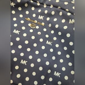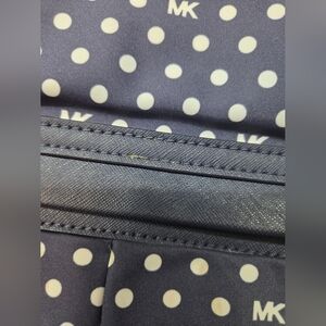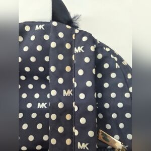 Micheal Kors nylon navy & white polka dot backpack with matching travel pouch. Good used condition. Has some light staining throughout - please see all photos and don't hesitate to ask for more. ( have not tried to treat ) Some of the thread has begun to come out as shown as well. Otherwise plenty of life left. A few untreated spots in the interior, also have no tried to treat. From a pet and smoke free home.